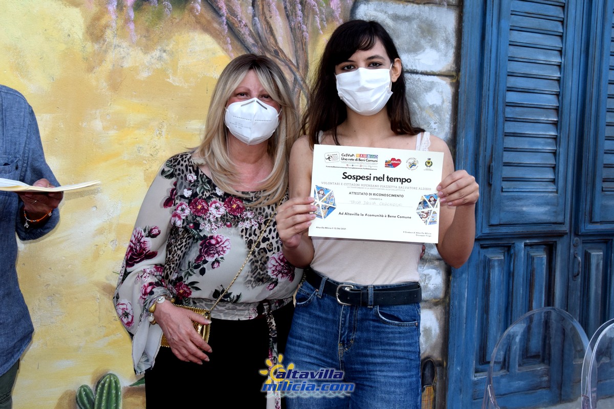 Consegna attestato agli artisti durante l'inaugurazione murales “Sospesi nel tempo” in piazza Aldisio